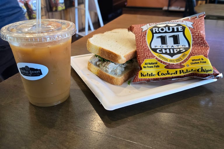 I ended up with the mint matcha latte, which was beyond sweet and definitely leaned more dessert than drink, but still refreshing. We both went for the chicken salad sandwiches, served up with a side of chips. Nothing fancy, just solid, satisfying comfort food. The café had a calm, cozy vibe, and we noticed several folks coming in after church, chatting over lunch like it was their usual Sunday ritual.